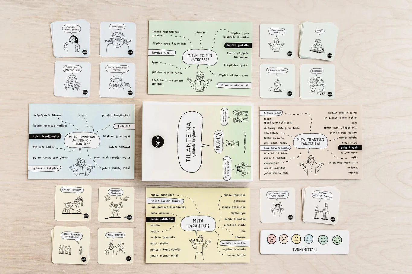 Kuormitus on usein tavalla tai toisella taustalla erilaisissa selvitettävissä tilanteissa. Iso osa kohtaamistyötä on erilaisten tilanteiden läpikäyminen ja sopivien keinojen löytäminen kuormituksen purkamiseen. Omien kokemustemme ja havaintojemme pohjalta lähdimme hahmottelemaan korttisarjaa, joka tukisi tässä sekä lapsia ja nuoria että lasten ja nuorten kanssa työskentelevien ammattilaisten työtä. Näin syntyi Oppikon Tilanteina -jälkiselvittelykortit.